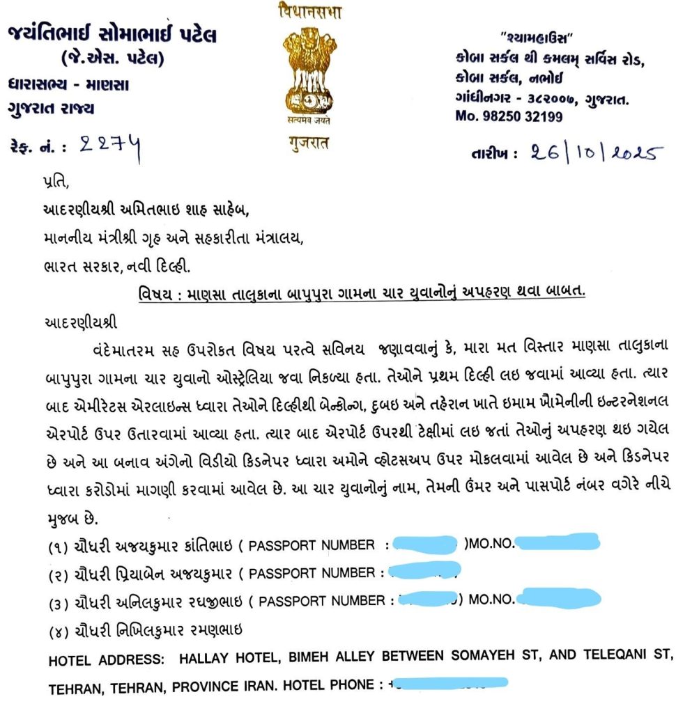 આ ગંભીર પરિસ્થિતિમાં, પરિવારોએ તાત્કાલિક સ્થાનિક નેતાઓનો સંપર્ક કર્યો. માણસાના ધારાસભ્ય જે. એસ. પટેલે કેન્દ્રીય ગૃહમંત્રી અમિત શાહને પત્ર લખીને તાત્કાલિક હસ્તક્ષેપ કરવા અપીલ કરી હતી. વિદેશ મંત્રાલય પણ સક્રિય થયું અને તહેરાનમાં ભારતીય દૂતાવાસ મારફતે ઈરાન સરકાર સાથે સંપર્ક સાધવામાં આવ્યો.