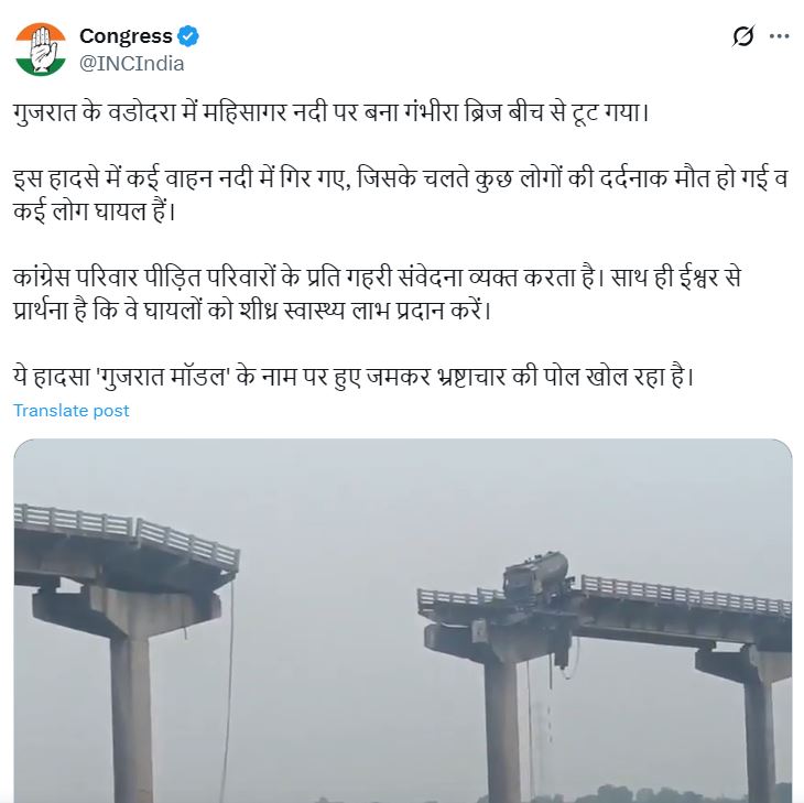 મહિસાગર નદી પર બનેલા આ બ્રિજનો મધ્ય ભાગ ધરાશાયી થતાં મોટી દુર્ઘટના સર્જાઈ હતી. આ ઘટના બાદ વિપક્ષી નેતાઓ ભાજપ સરકાર પર પ્રહારો કરી રહ્યા છે.