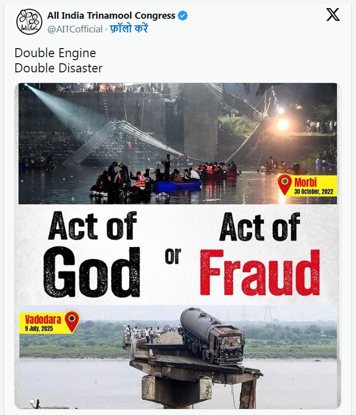 ગુજરાતના વડોદરા નજીક આવેલા મહિસાગર નદી પરનો એક બ્રિજ તૂટી પડતા 13 લોકોના મોત થયા છે. આ ઘટના બાદ ગુજરાતમાં ભારતીય જનતા પાર્ટી સરકાર વિપક્ષના નિશાના પર આવી ગઈ છે. કોંગ્રેસ અને તૃણમૂલ કોંગ્રેસ સહિતના વિપક્ષી દળોએ આ દુર્ઘટનાને લઈને સરકાર પર ભ્રષ્ટાચારના ગંભીર આરોપો લગાવ્યા છે અને સવાલ કર્યો છે કે શું આ એક્ટ ઑફ ગૉડ છે કે એક્ટ ઑફ ફ્રૉડ?