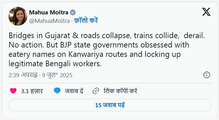 TMC સાંસદ મહુઆ મોઇત્રાએ જણાવ્યું કે ગુજરાત પુલ દુર્ઘટના જેવા અનેક કિસ્સાઓમાં કોઈ કાર્યવાહી કરવામાં આવી નથી. તેમણે કહ્યું કે ભાજપની રાજ્ય સરકારો કાંવડિયોના રસ્તાઓ પર રેસ્ટોરન્ટના નામ રાખવા અને વૈધ બંગાળી મજૂરોને જેલમાં બંધ કરવા પર ધ્યાન કેન્દ્રિત કરી રહી છે.