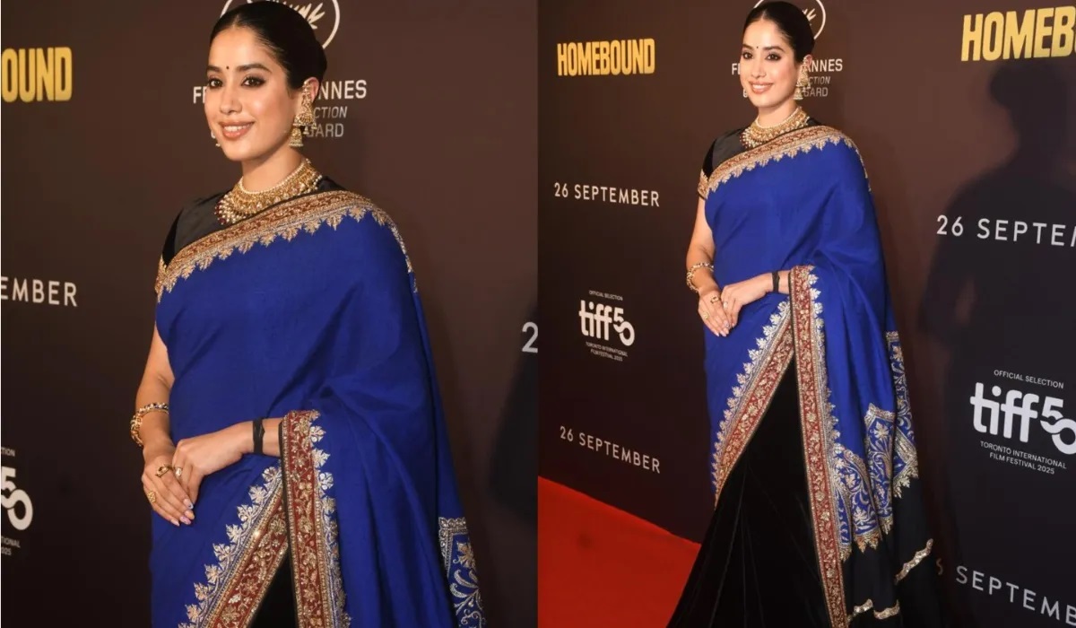 “હોમબાઉન્ડ” ફિલ્મના સ્ક્રીનિંગમાં જાહ્નવી કપૂરનો પરંપરાગત અવતાર જોવા મળ્યો હતો. પ્રીમિયર માટે, જાહ્નવી કપૂરે પોતાની સાડી પહેરીને બધાને પ્રભાવિત કર્યા, અને તેની સ્વર્ગસ્થ માતા, સુપ્રસિદ્ધ અભિનેત્રી શ્રીદેવીની યાદ અપાવે તેવું ફેશન સ્ટેટમેન્ટ પણ આપ્યું. અભિનેત્રી પ્રીમિયરમાં જટિલ સોનાની ભરતકામવાળી અદભુત, રોયલ નેવી બ્લુ અને બ્લેક સાડીમાં પહોંચી હતી.