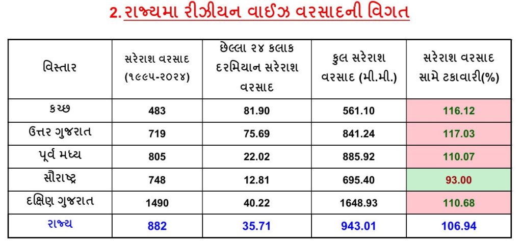 આ ભારે વરસાદને કારણે રાજ્યના 84 તાલુકાઓમાં 1000 મિ.મી.થી વધુ, 143 તાલુકાઓમાં 501 થી 1000 મિ.મી. અને 24 તાલુકાઓમાં 251 થી 500 મિ.મી. વરસાદ વરસ્યો છે. છેલ્લા 24 કલાકમાં 222 તાલુકાઓમાં વરસાદ નોંધાયો, જેમાં કચ્છના લખપતમાં 5.12 ઇંચ અને બનાસકાંઠાના ભાભરમાં 4.29 ઇંચ વરસાદનો સમાવેશ થાય છે.